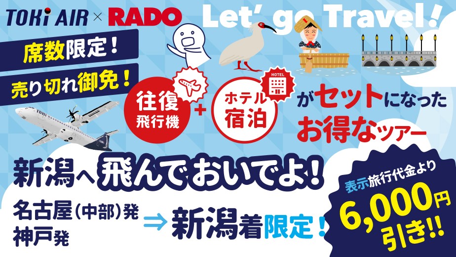名古屋(中部)・神戸発⇒新潟着の路線限定!表示旅行代金より1名様あたり6,000円引きのとてもお得なプランを発売開始しました!